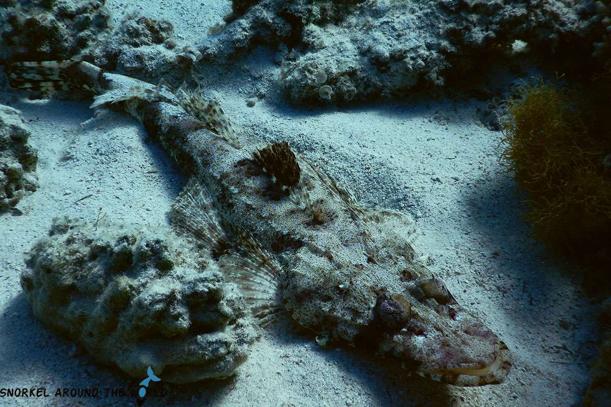 You can enter the water through a sandy lagoon to get to the Canyon. Snorkelers can follow the reef on the left side, where a wide variety of fish (anemonefish, butterflyfish, crocodilefish, unicornfish, pufferfish, lionfish, scorpionfish, etc…) can be observed around the coral structures. We saw here octopus and blue spotted rays, too.